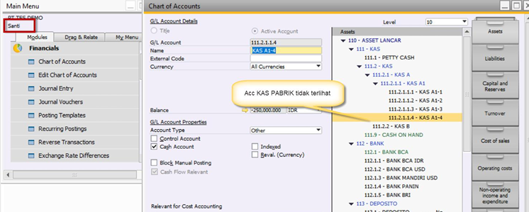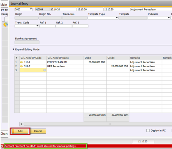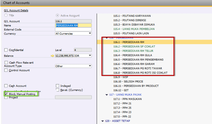 Account yang biasanya disetup tidak boleh manual posting cara penggunaan transaksinya adalah account persediaan. Apabila account persediaan dibuat transaksi manual menggunakan jurnal entry tanpa melalui transaksi persediaan seperti Goods Receipt Inventory, Goods Issue Inventory, Goods Receipt PO,Delivery dan Inventory Reval (menaikkan /menurunkan nilai persediaan) akan mengakibatkan nilai persediaan di Balance sheet dan Inventory Audit akan berbeda.